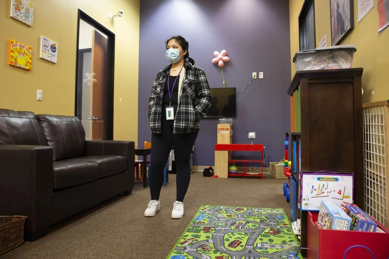 Services at the Family Justice Center of Washington County include a child care room, where family support worker Esthefania Aguiar tends to children while their parents are meeting with advocates for survivors of domestic violence
